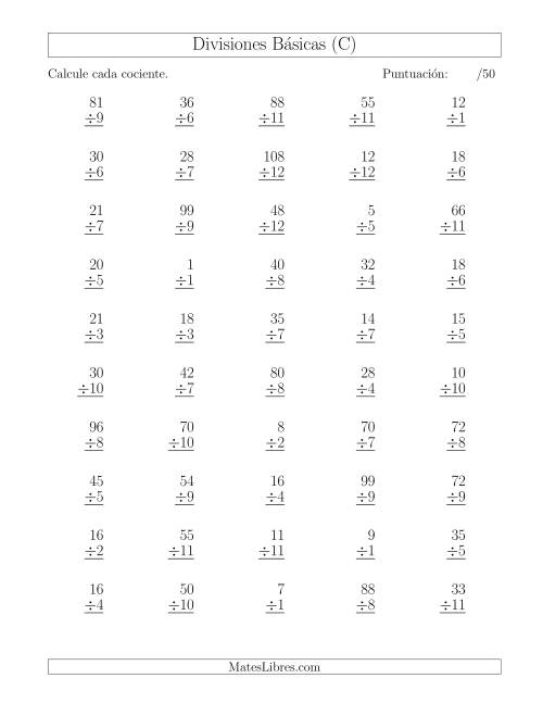Bienvenidos a La hoja de ejercicios de Divisiones con Dividendos hasta 144 (C) de la página de Hojas de Ejercicios de Divisións en MatesLibres.com. Esta hoja de ejercicios de fue creada en 2016-05-31 y ha sido vista 0 veces esta semana y 11 veces este mes. Puede ser impresa, descargada o guardada y utilizada en su clase, escuela en casa, o cualquier entorno educacional, para ayudar a alguien a aprender matemáticas.