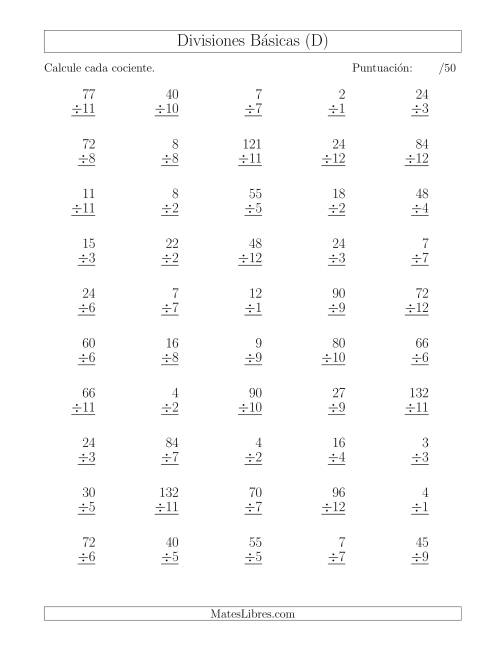Bienvenidos a La hoja de ejercicios de Divisiones con Dividendos hasta 144 (D) de la página de Hojas de Ejercicios de Divisións en MatesLibres.com. Esta hoja de ejercicios de fue creada en 2016-05-31 y ha sido vista 0 veces esta semana y 10 veces este mes. Puede ser impresa, descargada o guardada y utilizada en su clase, escuela en casa, o cualquier entorno educacional, para ayudar a alguien a aprender matemáticas.