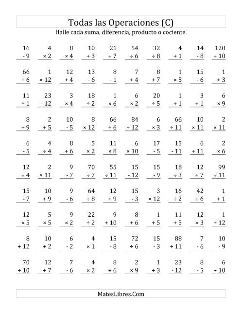 Bienvenidos a La hoja de ejercicios de Todas las Operaciones, Rango de 1 a 12 (C) de la página de Hojas de Ejercicios de Operaciones Mixtass en MatesLibres.com. Esta hoja de ejercicios de fue creada en 2013-06-21 y ha sido vista 3 veces esta semana y 16 veces este mes. Puede ser impresa, descargada o guardada y utilizada en su clase, escuela en casa, o cualquier entorno educacional, para ayudar a alguien a aprender matemáticas.