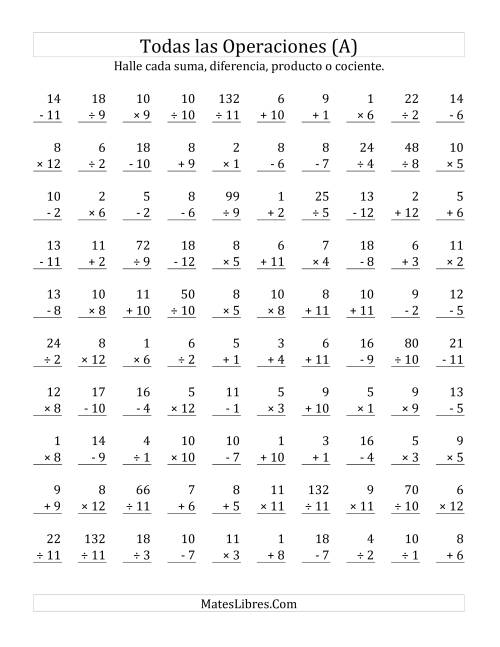 Bienvenidos a La hoja de ejercicios de Todas las Operaciones, Rango de 1 a 12 (Todas) de la página de Hojas de Ejercicios de Operaciones Mixtass en MatesLibres.com. Esta hoja de ejercicios de fue creada en 2013-05-27 y ha sido vista 1 veces esta semana y 15 veces este mes. Puede ser impresa, descargada o guardada y utilizada en su clase, escuela en casa, o cualquier entorno educacional, para ayudar a alguien a aprender matemáticas.